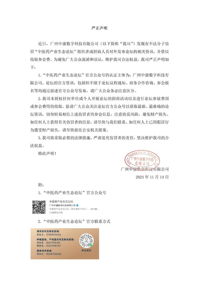 近日,广州中康数字科技有限公司(以下简称“我司”)发现有不法分子仿冒“中医药产业生态论坛”组织者或招商人员对外发布论坛的相关资讯,并借以收取参会费。为避免广大公众混淆和误认,维护我司合法权益,我司严正声明如下: